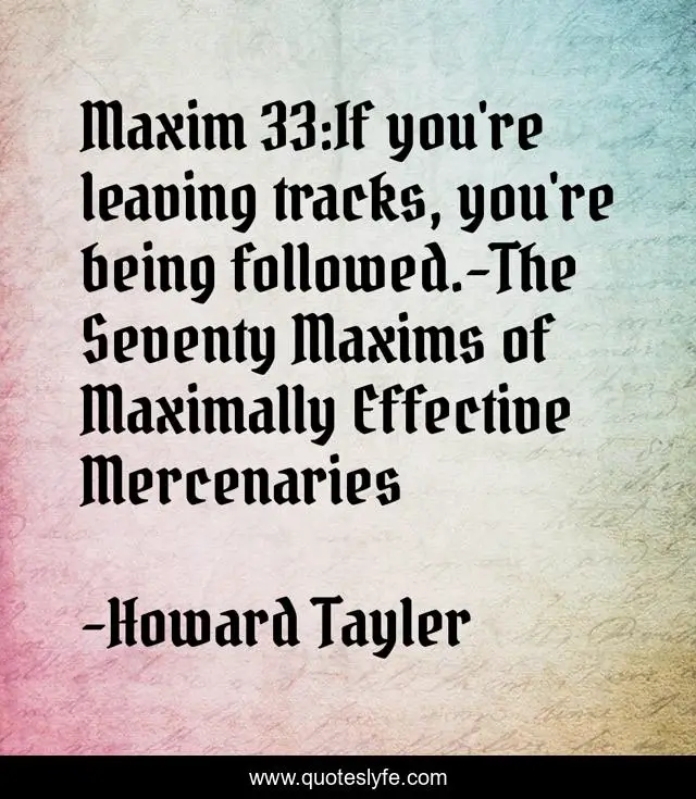 This page presents the quote "Maxim 33:If you're leaving tracks, you're being followed.-The Seventy Maxims of Maximally Effective Mercenaries". Author of this quote is Howard Tayler. This quote is about tracks, followed, internet,.
