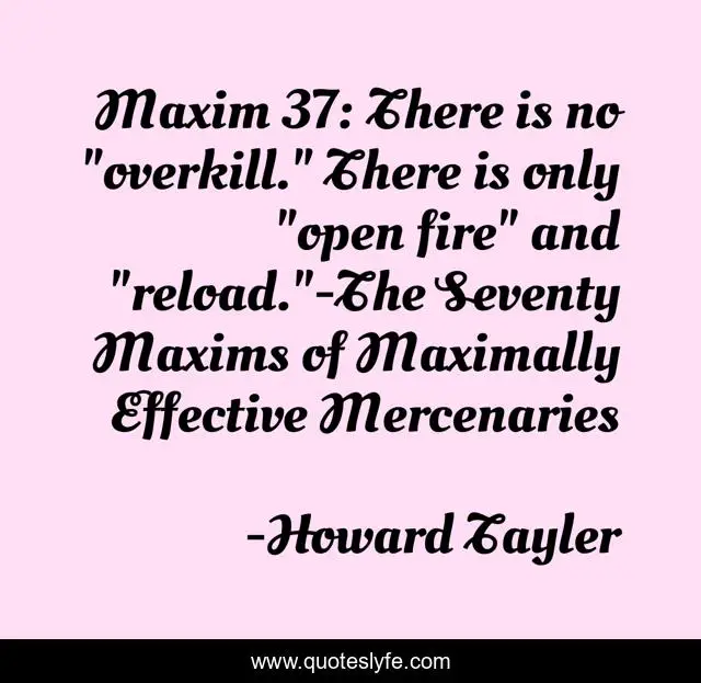 This page presents the quote "Maxim 37: There is no "overkill." There is only "open fire" and "reload."-The Seventy Maxims of Maximally Effective Mercenaries". Author of this quote is Howard Tayler. This quote is about overkill, violence, humour, rules-to-live-by,.