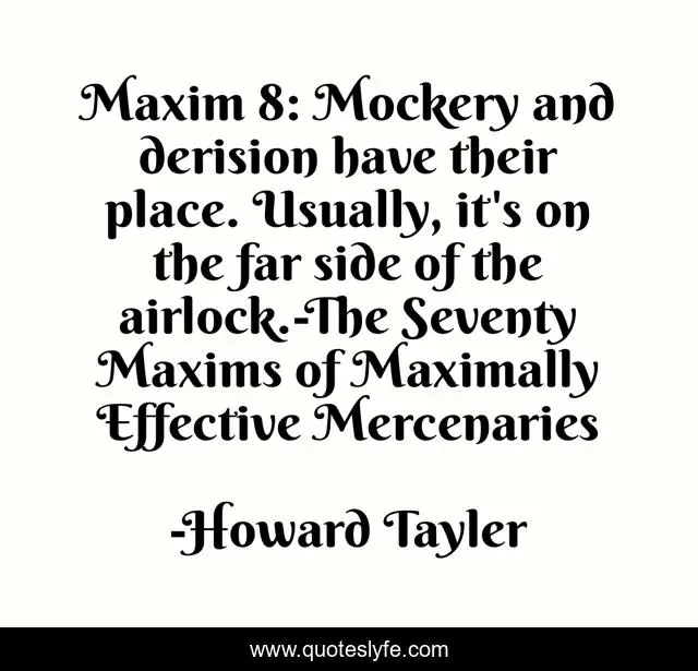 This page presents the quote "Maxim 8: Mockery and derision have their place. Usually, it's on the far side of the airlock.-The Seventy Maxims of Maximally Effective Mercenaries". Author of this quote is Howard Tayler. This quote is about airlock, humour, sci-fi, rules-to-live-by, mockery,.