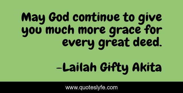 This page presents the quote "May God continue to give you much more grace for every great deed.". Author of this quote is Lailah Gifty Akita. This quote is about spiritual-wisdom, god, greatness, self-motivation, christian-life, good-deeds, grace,.
