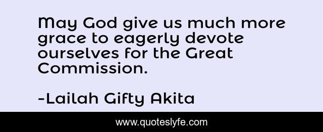 This page presents the quote "May God give us much more grace to eagerly devote ourselves for the Great Commission.". Author of this quote is Lailah Gifty Akita. This quote is about faith, spiritual, christian, service, mission, calling, great-commission, preaching, grace,.