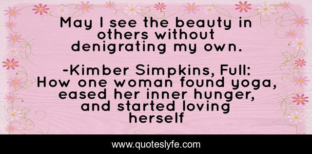 This page presents the quote "May I see the beauty in others without denigrating my own.". Author of this quote is Kimber Simpkins, Full: How one woman found yoga, eased her inner hunger, and started loving herself. This quote is about spirituality, body-image, memoir, beauty, self-help,.