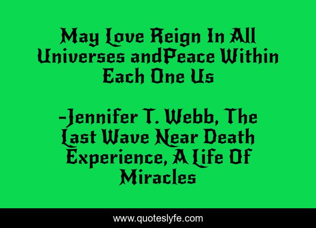"Jennifer T. Webb, The Last Wave Near Death Experience, A Life Of Miracles Quotes." Quoteslyfe.com, 2025. Fri. 05 Dec. 2025. <https://www.quoteslyfe.com/quote/May-Love-Reign-In-All-Universes-andPeace-115108>.