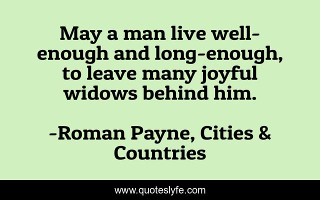 This page presents the quote "May a man live well-enough and long-enough, to leave many joyful widows behind him.". Author of this quote is Roman Payne, Cities & Countries. This quote is about life, roman-payne, polygamy, men, wives, pleasure, widows,.