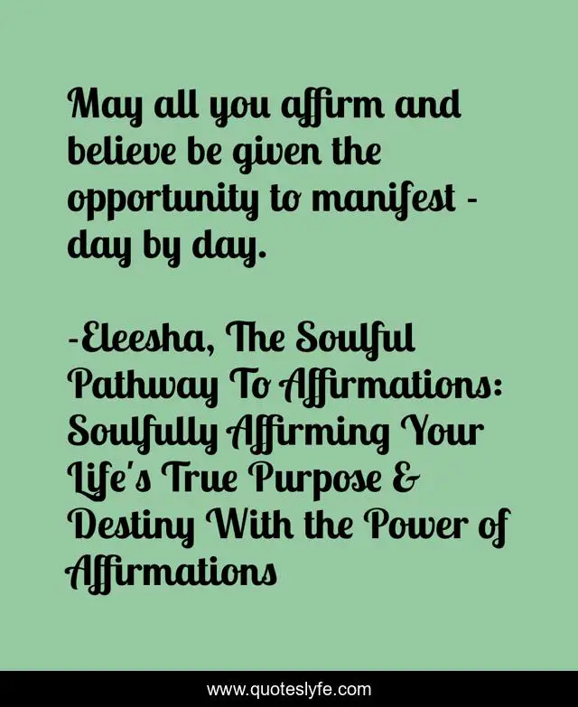 "Eleesha, The Soulful Pathway To Affirmations: Soulfully Affirming Your Life's True Purpose & Destiny With the Power of Affirmations Quotes." Quoteslyfe.com, 2025. Sat. 06 Dec. 2025. <https://www.quoteslyfe.com/quote/May-all-you-affirm-and-believe-be-205063>.