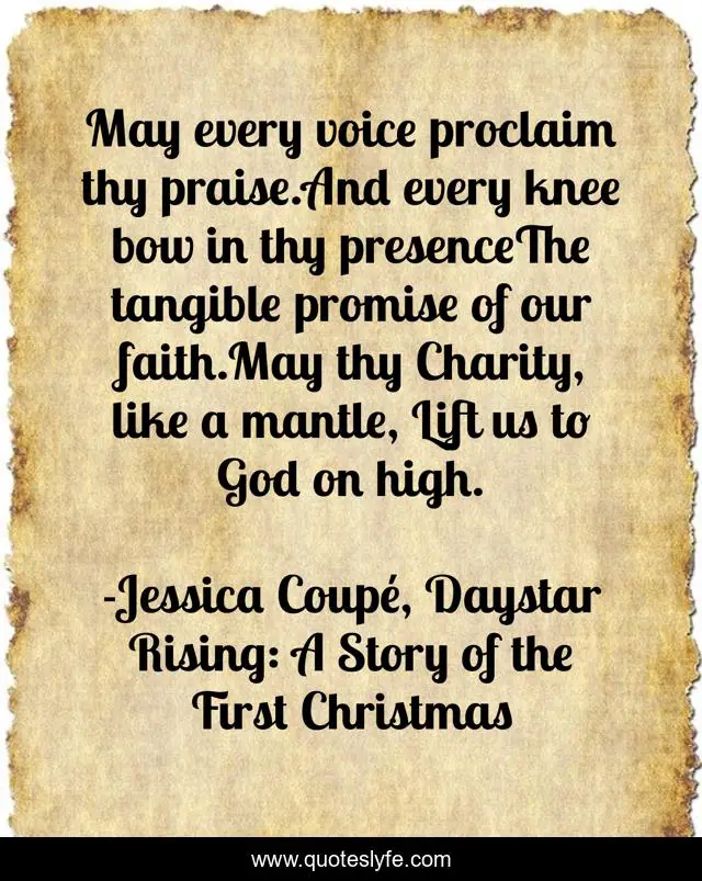 This page presents the quote "May every voice proclaim thy praise.And every knee bow in thy presenceThe tangible promise of our faith.May thy Charity, like a mantle, Lift us to God on high.". Author of this quote is Jessica Coupé, Daystar Rising: A Story of the First Christmas. This quote is about jesus-christ, joy, nativity, prayer, atonement, hope, charity,.