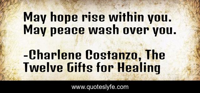This page presents the quote "May hope rise within you. May peace wash over you.". Author of this quote is Charlene Costanzo, The Twelve Gifts for Healing. This quote is about inner-gifts, peace, blessing, healing, hope, inspiration,.