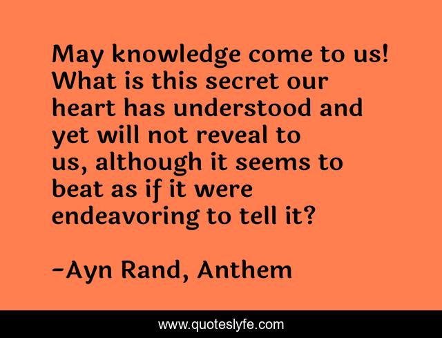 This page presents the quote "May knowledge come to us! What is this secret our heart has understood and yet will not reveal to us, although it seems to beat as if it were endeavoring to tell it?". Author of this quote is Ayn Rand, Anthem. This quote is about secret, knowledge,.