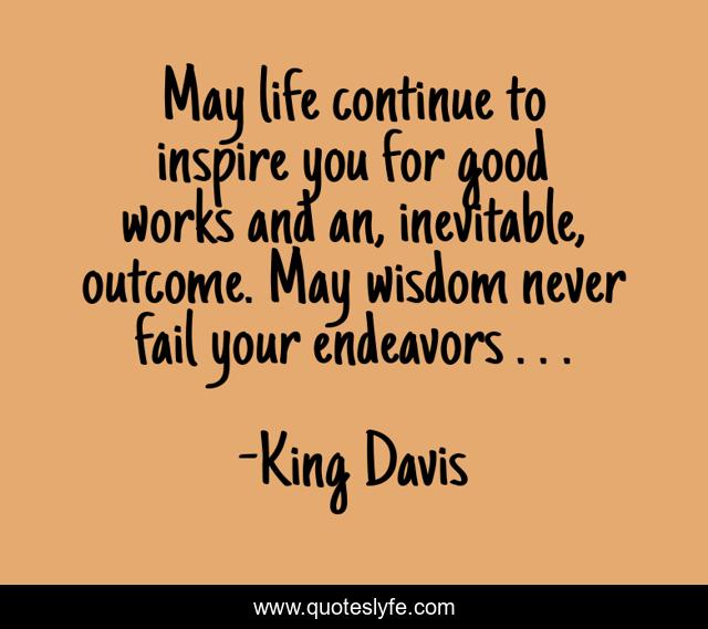 This page presents the quote "May life continue to inspire you for good works and an, inevitable, outcome. May wisdom never fail your endeavors . . .". Author of this quote is King Davis. This quote is about initiatives, kingdavisetal, ideas, intuition,.
