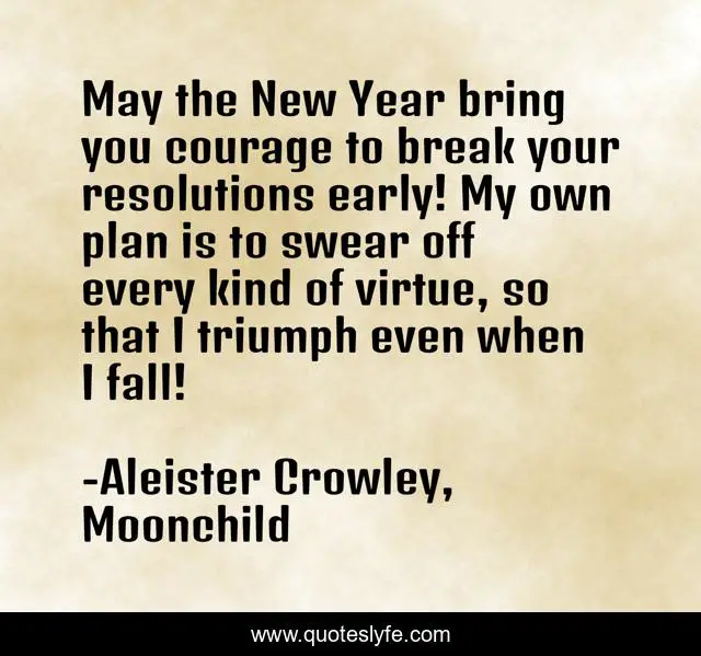 This page presents the quote "May the New Year bring you courage to break your resolutions early! My own plan is to swear off every kind of virtue, so that I triumph even when I fall!". Author of this quote is Aleister Crowley, Moonchild. This quote is about new-year, humor,.