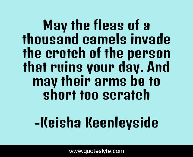 This page presents the quote "May the fleas of a thousand camels invade the crotch of the person that ruins your day. And may their arms be to short too scratch". Author of this quote is Keisha Keenleyside. This quote is about funny, humor, humour, revenge, strife, malediction, amusing, inspirational, anger,.