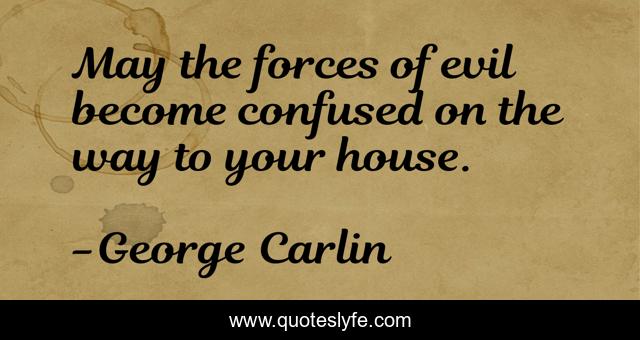 This page presents the quote "May the forces of evil become confused on the way to your house.". Author of this quote is George Carlin. This quote is about humor, goodwill, evil, wishes, inspirational, benediction, enthusiasm,.
