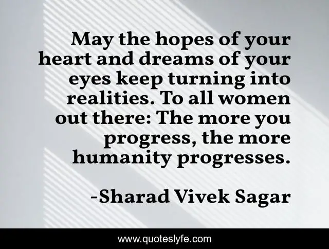 This page presents the quote "May the hopes of your heart and dreams of your eyes keep turning into realities. To all women out there: The more you progress, the more humanity progresses.". Author of this quote is Sharad Vivek Sagar. This quote is about heart, feminism, inspirational, enthusiasm, hopes, progress, humanity, dreams, women,.