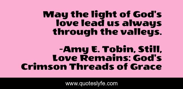 This page presents the quote "May the light of God's love lead us always through the valleys.". Author of this quote is Amy E. Tobin, Still, Love Remains: God's Crimson Threads of Grace. This quote is about enthusiasm, christian, inspirational, prayer,.