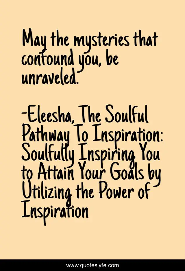 "Eleesha, The Soulful Pathway To Inspiration: Soulfully Inspiring You to Attain Your Goals by Utilizing the Power of Inspiration Quotes." Quoteslyfe.com, 2025. Sat. 06 Dec. 2025. <https://www.quoteslyfe.com/quote/May-the-mysteries-that-confound-you-be-205054>.