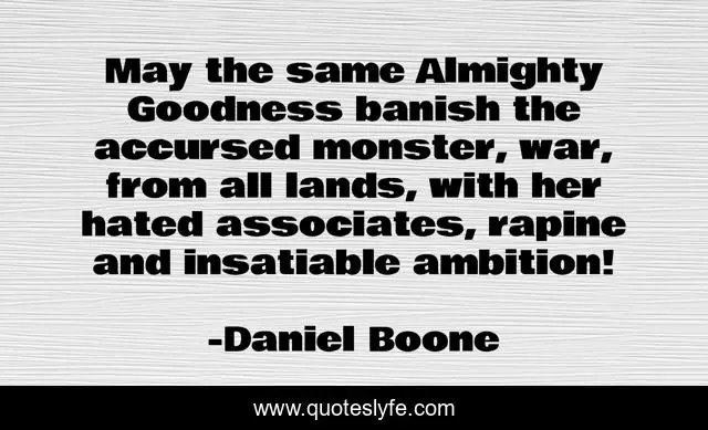 This page presents the quote "May the same Almighty Goodness banish the accursed monster, war, from all lands, with her hated associates, rapine and insatiable ambition!". Author of this quote is Daniel Boone. This quote is about goodness, her, ambition,.