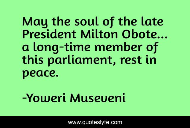 This page presents the quote "May the soul of the late President Milton Obote... a long-time member of this parliament, rest in peace.". Author of this quote is Yoweri Museveni. This quote is about late, soul, rest,.