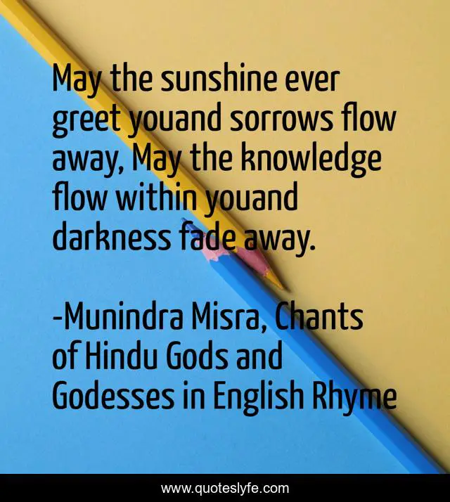 This page presents the quote "May the sunshine ever greet youand sorrows flow away, May the knowledge flow within youand darkness fade away.". Author of this quote is Munindra Misra, Chants of Hindu Gods and Godesses in English Rhyme. This quote is about culture, hindu, hinduism, spirituality, religion,.