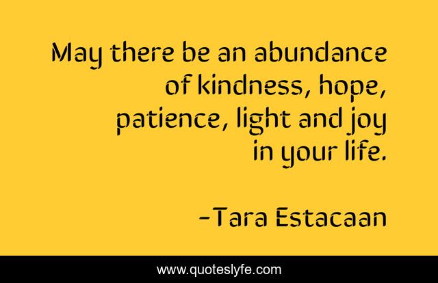 This page presents the quote "May there be an abundance of kindness, hope, patience, light and joy in your life.". Author of this quote is Tara Estacaan. This quote is about joy, peace, hope-for-each-day, patience,.