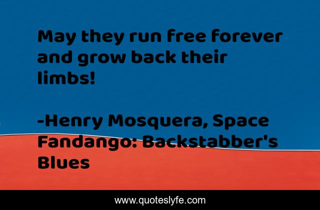 This page presents the quote "May they run free forever and grow back their limbs!". Author of this quote is Henry Mosquera, Space Fandango: Backstabber's Blues. This quote is about noir, sci-fi, science-fiction, crime, space-adventure, space-opera, adventure, action, humor,.