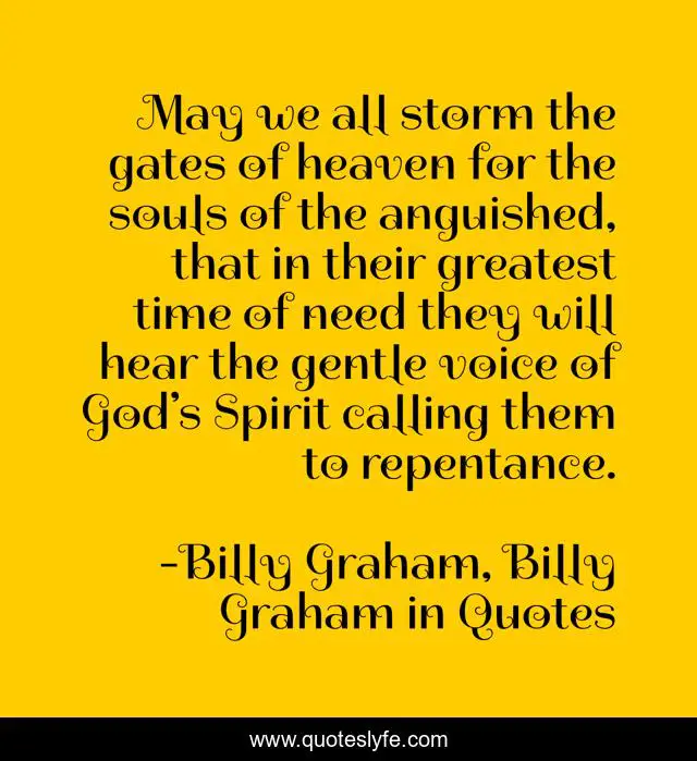 This page presents the quote "May we all storm the gates of heaven for the souls of the anguished, that in their greatest time of need they will hear the gentle voice of God’s Spirit calling them to repentance.". Author of this quote is Billy Graham, Billy Graham in Quotes. This quote is about billy-graham, the-soul,.