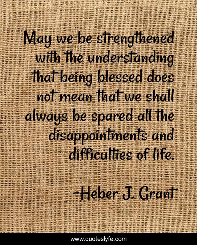 This page presents the quote "May we be strengthened with the understanding that being blessed does not mean that we shall always be spared all the disappointments and difficulties of life.". Author of this quote is Heber J. Grant. .