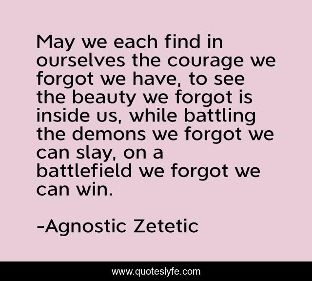 This page presents the quote "May we each find in ourselves the courage we forgot we have, to see the beauty we forgot is inside us, while battling the demons we forgot we can slay, on a battlefield we forgot we can win.". Author of this quote is Agnostic Zetetic. This quote is about relationships, battlefield, life, love, hiv, beauty, survival, demons, courage,.