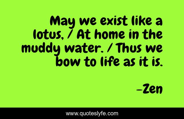 This page presents the quote "May we exist like a lotus, / At home in the muddy water. / Thus we bow to life as it is.". Author of this quote is Zen. This quote is about lotus, zen,.