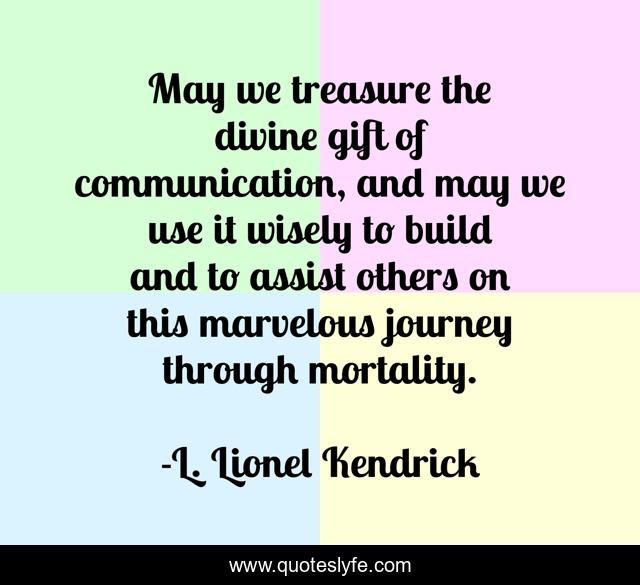 This page presents the quote "May we treasure the divine gift of communication, and may we use it wisely to build and to assist others on this marvelous journey through mortality.". Author of this quote is L. Lionel Kendrick. This quote is about treasure, gift, journey,.