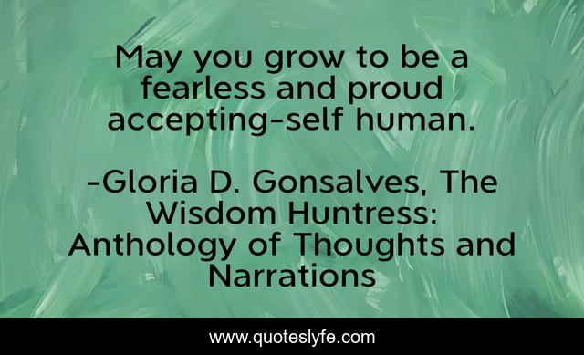 This page presents the quote "May you grow to be a fearless and proud accepting-self human.". Author of this quote is Gloria D. Gonsalves, The Wisdom Huntress: Anthology of Thoughts and Narrations. This quote is about quote, quotes,.