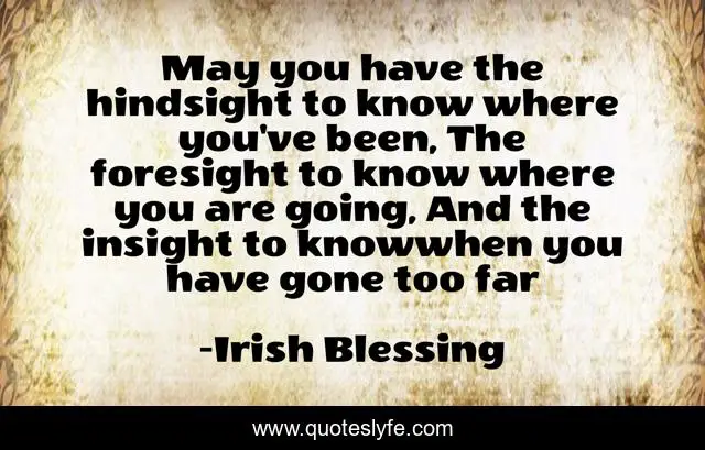 This page presents the quote "May you have the hindsight to know where you've been, The foresight to know where you are going, And the insight to knowwhen you have gone too far". Author of this quote is Irish Blessing. This quote is about irish, blessing,.
