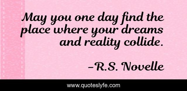 This page presents the quote "May you one day find the place where your dreams and reality collide.". Author of this quote is R.S. Novelle. This quote is about life, positive, motivational, confidence, reality, live, happiness, inspirational, enthusiasm,.