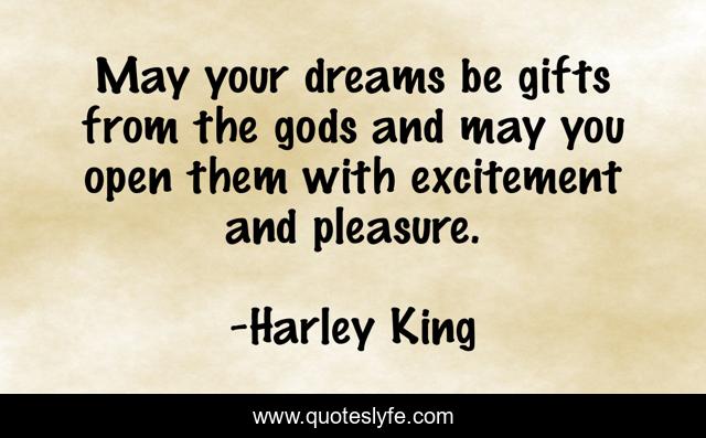 This page presents the quote "May your dreams be gifts from the gods and may you open them with excitement and pleasure.". Author of this quote is Harley King. This quote is about gifts, gods, dreams, pleasure,.