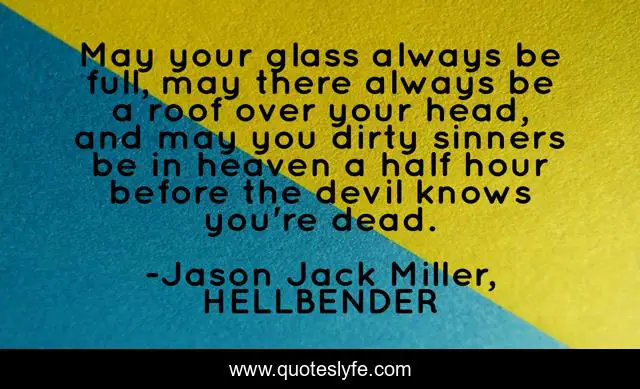 This page presents the quote "May your glass always be full, may there always be a roof over your head, and may you dirty sinners be in heaven a half hour before the devil knows you're dead.". Author of this quote is Jason Jack Miller, HELLBENDER. This quote is about hellbender, witchcraft, appalachian, jason-jack-miller, west-virginia, supernatural, murder-ballads-and-whiskey, witch, appalachian-fiction,.