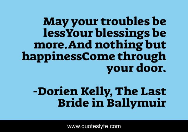 This page presents the quote "May your troubles be lessYour blessings be more.And nothing but happinessCome through your door.". Author of this quote is Dorien Kelly, The Last Bride in Ballymuir. This quote is about blessings, happiness,.