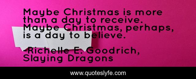 This page presents the quote "Maybe Christmas is more than a day to receive. Maybe Christmas, perhaps, is a day to believe.". Author of this quote is Richelle E. Goodrich, Slaying Dragons. This quote is about richelle-e-goodrich, christmas-is, richelle, a-day-to-believe, richelle-goodrich, christmas,.
