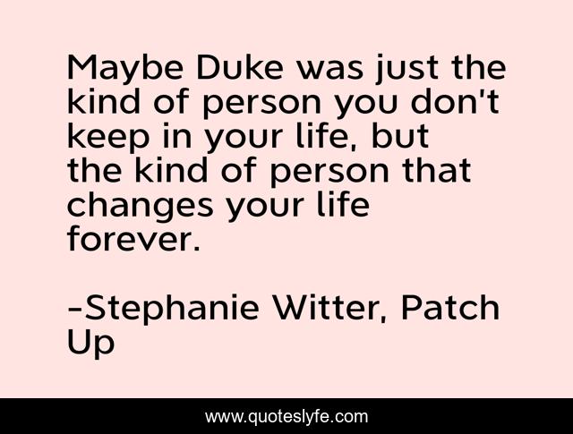 This page presents the quote "Maybe Duke was just the kind of person you don’t keep in your life, but the kind of person that changes your life forever.". Author of this quote is Stephanie Witter, Patch Up. This quote is about new-adult, contemporary-romance, contemporary, romance, academic, abuse, college,.