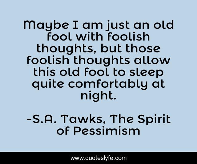 This page presents the quote "Maybe I am just an old fool with foolish thoughts, but those foolish thoughts allow this old fool to sleep quite comfortably at night.". Author of this quote is S.A. Tawks, The Spirit of Pessimism. This quote is about spirituality, author, writing, imagination, reader, reading,.