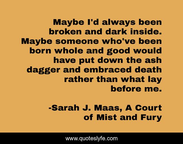 This page presents the quote "Maybe I'd always been broken and dark inside. Maybe someone who've been born whole and good would have put down the ash dagger and embraced death rather than what lay before me.". Author of this quote is Sarah J. Maas, A Court of Mist and Fury. This quote is about beautiful, beginning, sarah-j-maas, introduction, a-court-of-mist-and-fury, dark, broken, feyre, young-adult,.