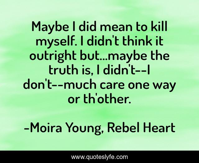 This page presents the quote "Maybe I did mean to kill myself. I didn't think it outright but...maybe the truth is, I didn't--I don't--much care one way or th'other.". Author of this quote is Moira Young, Rebel Heart. .