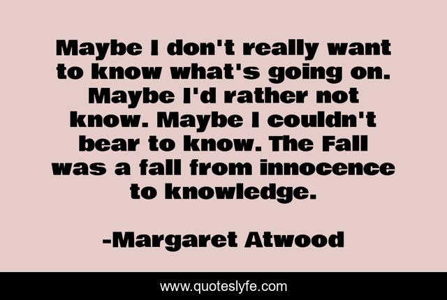 This page presents the quote "Maybe I don't really want to know what's going on. Maybe I'd rather not know. Maybe I couldn't bear to know. The Fall was a fall from innocence to knowledge.". Author of this quote is Margaret Atwood. .