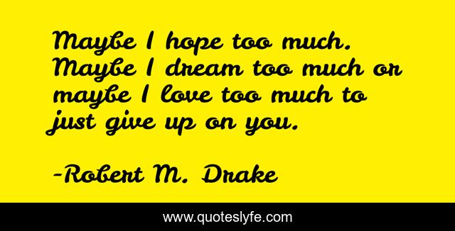 This page presents the quote "Maybe I hope too much. Maybe I dream too much or maybe I love too much to just give up on you.". Author of this quote is Robert M. Drake. This quote is about lovequotes, sadquotes, poetry, quotes, instadaily, happyquotes, relationships, sayings, writer,.