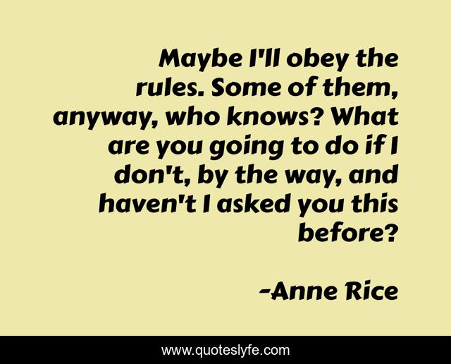 This page presents the quote "Maybe I'll obey the rules. Some of them, anyway, who knows? What are you going to do if I don't, by the way, and haven't I asked you this before?". Author of this quote is Anne Rice. This quote is about rules, lestat-de-lioncourt,.