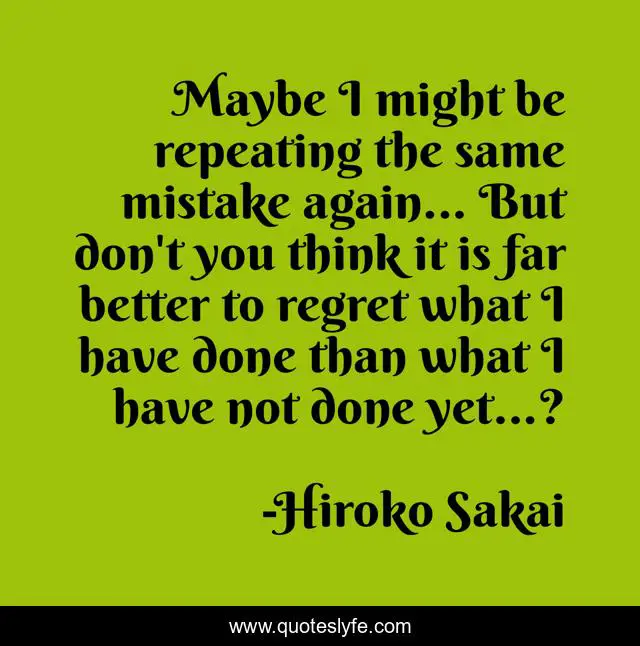 This page presents the quote "Maybe I might be repeating the same mistake again... But don't you think it is far better to regret what I have done than what I have not done yet...?". Author of this quote is Hiroko Sakai. This quote is about challenge, regret, mistake,.
