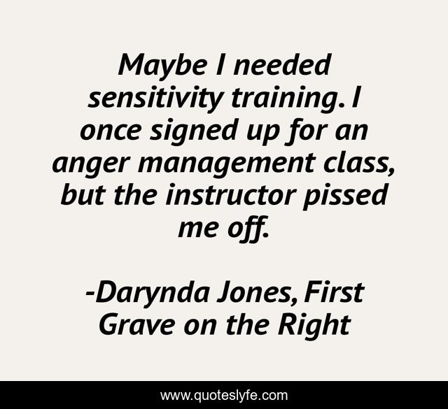 This page presents the quote "Maybe I needed sensitivity training. I once signed up for an anger management class, but the instructor pissed me off.". Author of this quote is Darynda Jones, First Grave on the Right. This quote is about urban-fantasy, paranormal-romance,.
