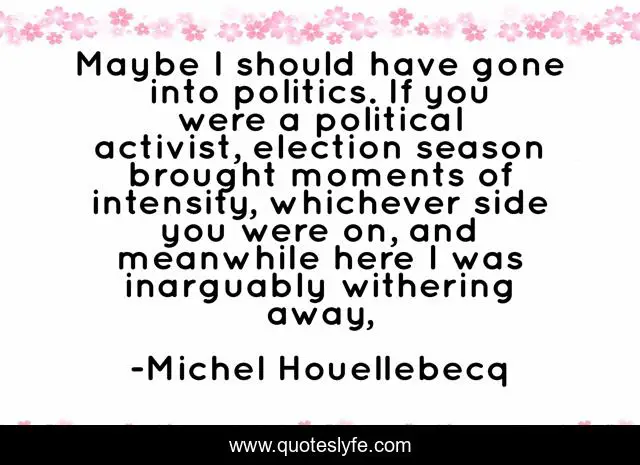 This page presents the quote "Maybe I should have gone into politics. If you were a political activist, election season brought moments of intensity, whichever side you were on, and meanwhile here I was inarguably withering away, ". Author of this quote is Michel Houellebecq. This quote is about politics, philosophy, submission, nihilism,.