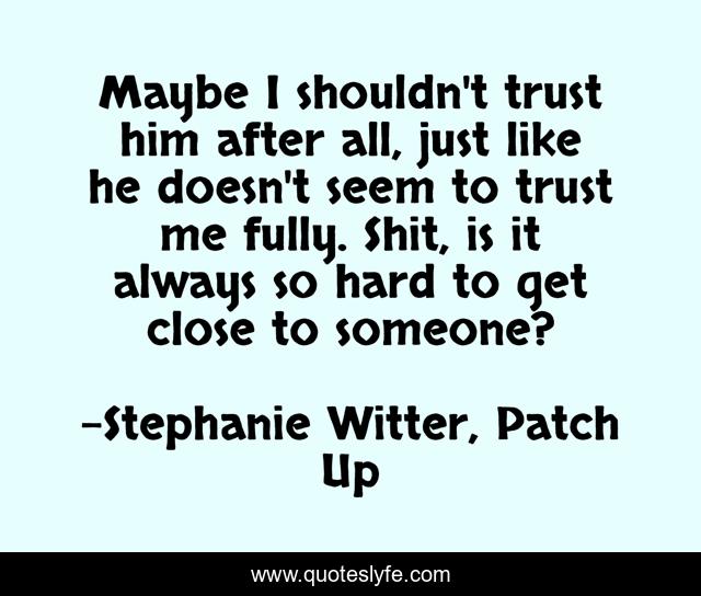This page presents the quote "Maybe I shouldn't trust him after all, just like he doesn't seem to trust me fully. Shit, is it always so hard to get close to someone?". Author of this quote is Stephanie Witter, Patch Up. This quote is about drama, new-adult, contemporary-romance,.
