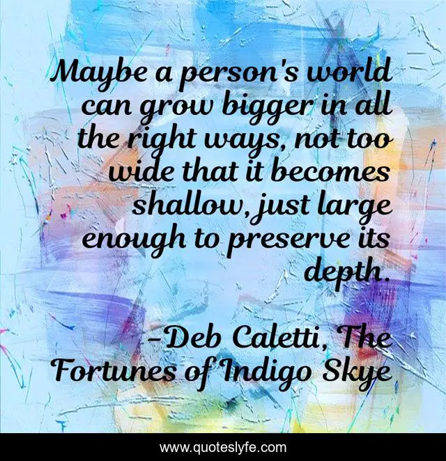 This page presents the quote "Maybe a person's world can grow bigger in all the right ways, not too wide that it becomes shallow, just large enough to preserve its depth.". Author of this quote is Deb Caletti, The Fortunes of Indigo Skye. This quote is about preserve, people, shallow, depth, growing, world, bigger,.