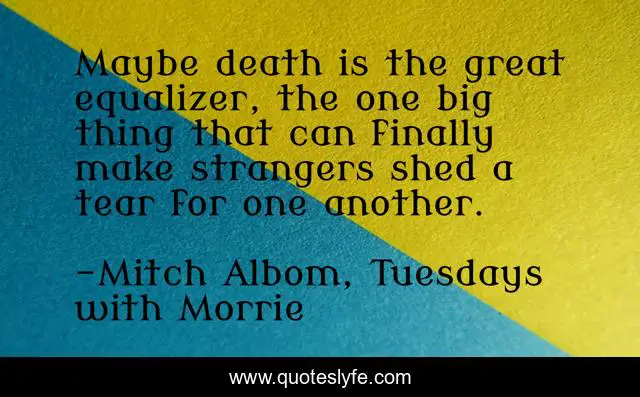 This page presents the quote "Maybe death is the great equalizer, the one big thing that can finally make strangers shed a tear for one another.". Author of this quote is Mitch Albom, Tuesdays with Morrie. .