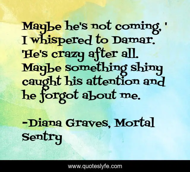 This page presents the quote "Maybe he's not coming, ' I whispered to Damar. 'He's crazy after all. Maybe something shiny caught his attention and he forgot about me.". Author of this quote is Diana Graves, Mortal Sentry. This quote is about daemons, magic, paranormal, demons, vampires,.